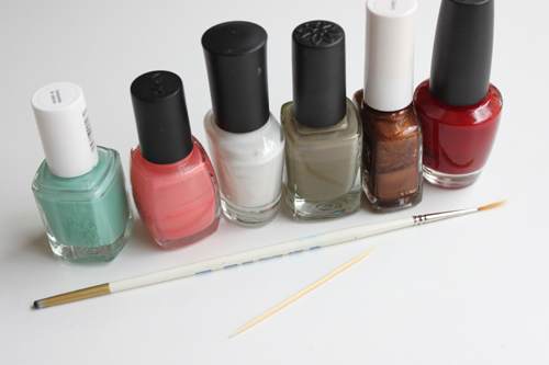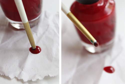 Take some of your cherry red polish & drop it onto some scrap paper or foil. Using the back end of your paint brush, dip it into the paint.