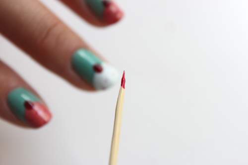 This part is optional, but you can take a toothpick and dip into any colour of nail polish. Then dab the toothpink on an angle onto the ice cream to create sprinkles!