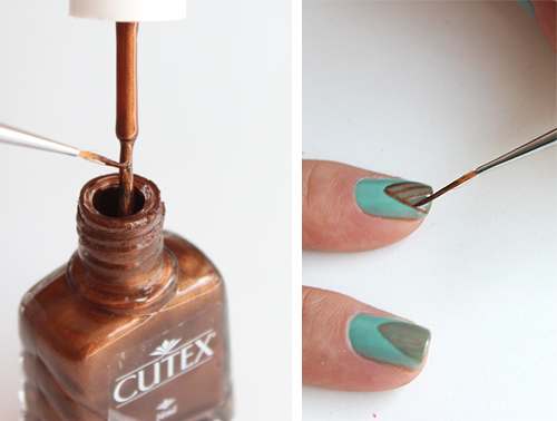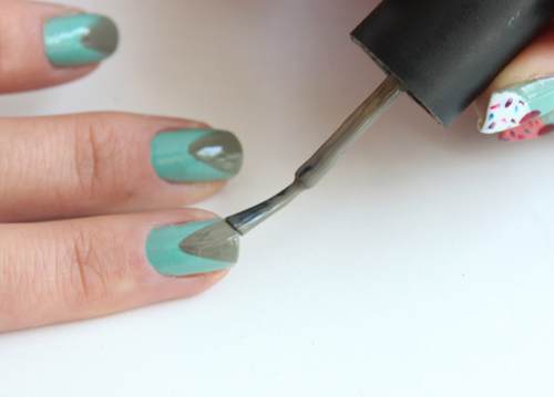 Then take your lighter brown and make triangular shapes on the tips of your nails on your OTHER hand. They don’t have to be perfect.