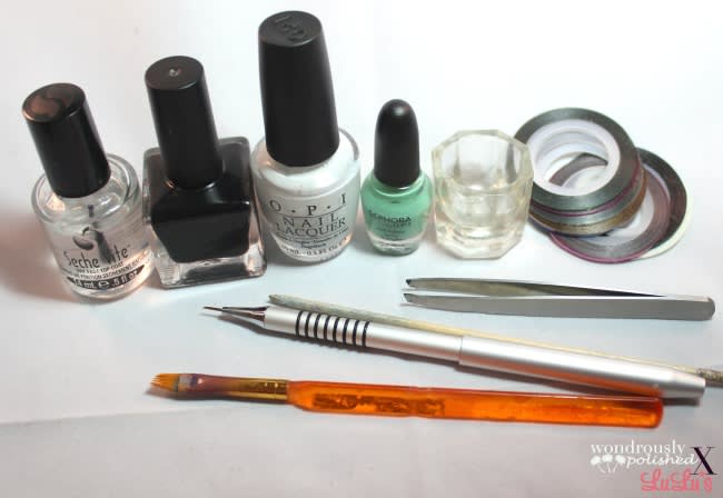 - 3 different colored polishes (white, black and mint for this look)