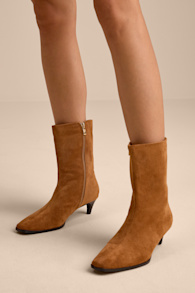 Lulus Carla Cognac Suede Kitten Heel Mid-Calf Booties