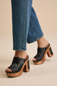Dingo Free Spirit Black Leather Wooden Platform Slide Sandals