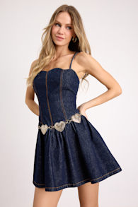 Lulus Cataleya Dark Wash Denim Boat Neck Mini Dress