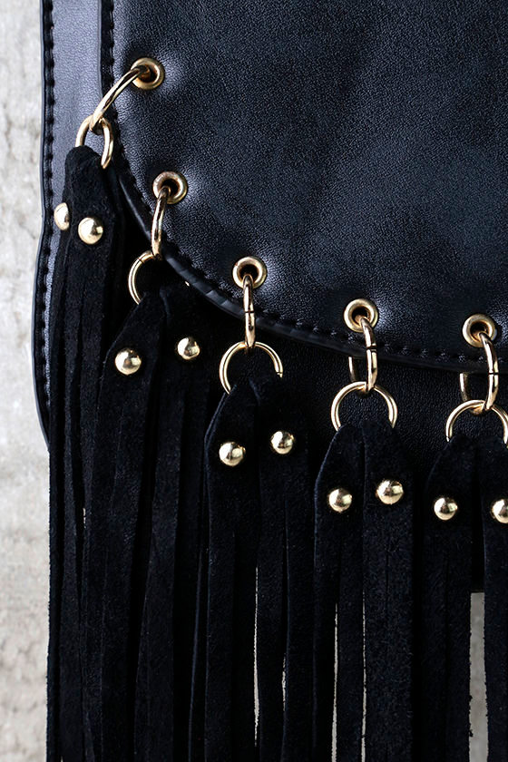 You'll create good vibes only when you head out with the Above the Fray Black Fringe Purse! This structured vegan leather bag, with fringe accents and gold hardware, is the perfect size for all your essentials. Lift the front flap from magnetic closure to reveal a front pocket and interior zipper pocket. Adjustable strap measures 38" at longest adjustment.