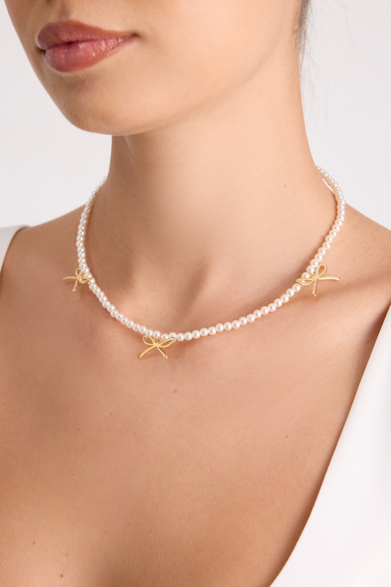 Add an adorable touch to your luxe ensembles with this luminous little necklace, crafted from a string of gleaming faux pearls. The classic silhouette features a trio of shiny, gold-toned bow details for a coquette-chic finish. Pair with an off-the-shoulder neckline for maximum attention!