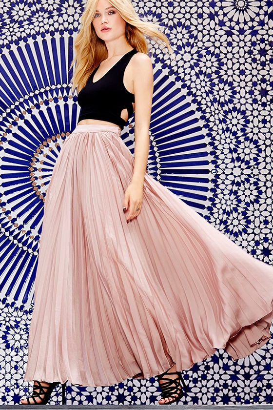 From morning market to busy bistros, there's hundreds of reasons to go out for the day in the Back in a Minute Beige Maxi Skirt! This woven poly skirt has a luxurious satiny finish, with a banded high-waist and accordion pleated design that travels down to a full maxi skirt. Hidden side zipper and clasp closure.