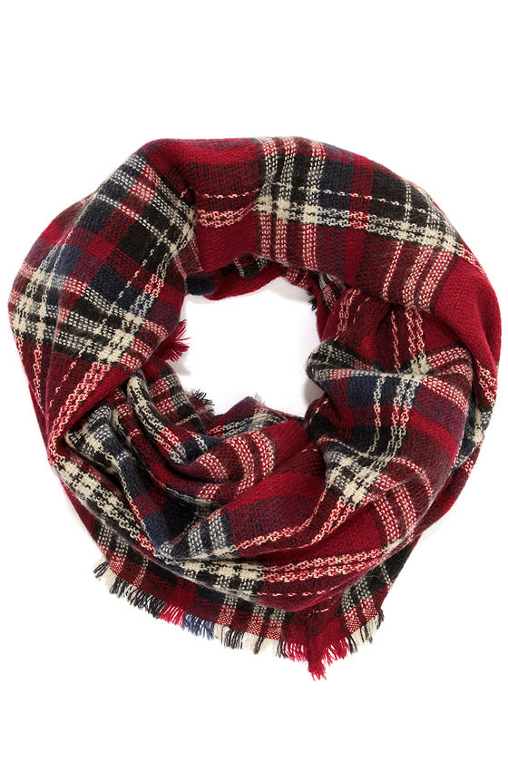 Take your look from the bench to center field in the Bench Warmer Red Plaid Infinity Scarf! Festive red, black, and ivory plaid (with touches of navy blue) forms a lightweight wool-blend infinity scarf with a frayed back-stitched edge. Wrap this wide scarf around your neck twice to complete your cozy ensemble. Scarf measures 28" wide with a 60" circumference. 30% Wool. 70% Acrylic. Wash Cold.