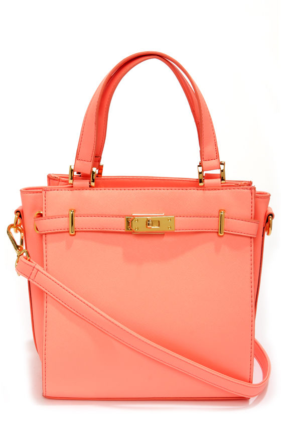 Get your day started off right with the Bright and Early Neon Coral Purse! Neon coral vegan leather sculpts a chic structured exterior that's extra dazzling thanks to shiny gold hardware. Unlatch front twist lock and unzip at top to reveal a fun striped lining with two interior pockets. Carry from twin tote handles with a 5.5" drop, or clip on the adjustable shoulder strap for a convenient cross-body option. Purse measures 9" wide, 9.5" tall, and 5.5" deep. 100% Polyurethane.