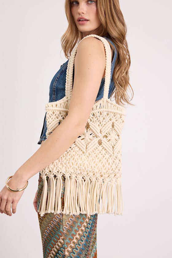 The ultimate "carry it all" accessory for a summer full of sun and fun, this woven macrame-style tote is not only spacious but stylish, too. Twin tote handles support the sheer silhouette, featuring an open top and long fringe trim that sways from the bottom.