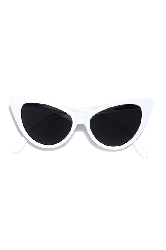 The Clouded Leopard White Cat-Eye Sunglasses will have you pouncing from Cloud 8 to Cloud 9! Bold white cat-eye frames surround classic and mysterious black tinted lenses. UV 400. Frames measure 5.5" wide. Arms measure 5.5" long. Man made materials.