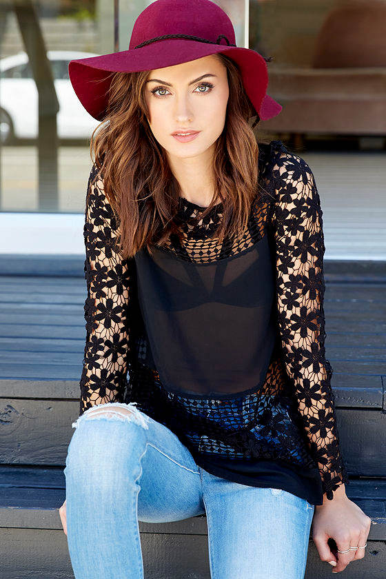 The Clover Club Black Lace Top can get you into even the most exclusive parties! This sheer black woven top has a floral patterned crocheted yoke and a bateau neckline, plus matching crocheted long sleeves. A central panel of sheer Georgette fabric wraps around the back to create a segmented design of lace and varying crochet patterns. Exposed back silver zipper. Unlined. Model is 5'8" and wearing a size small. Self: 100% Polyester. Contrast: 100% Cotton. Hand Wash Cold.