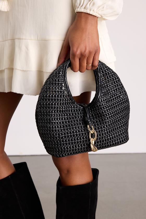 A chic plus one that always lends a luxe aesthetic, this vegan leather handbag by Dolce Vita elevates countless looks with its versatile silhouette. A woven texture sweeps across the surface of the sleek flat-bottom design, complete with a sturdy top handle. A securing strap rests atop the spacious interior, boasting a gold-toned, chunky chain-link detail that dangles below.