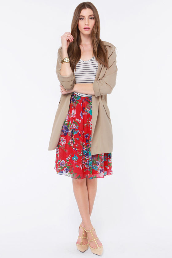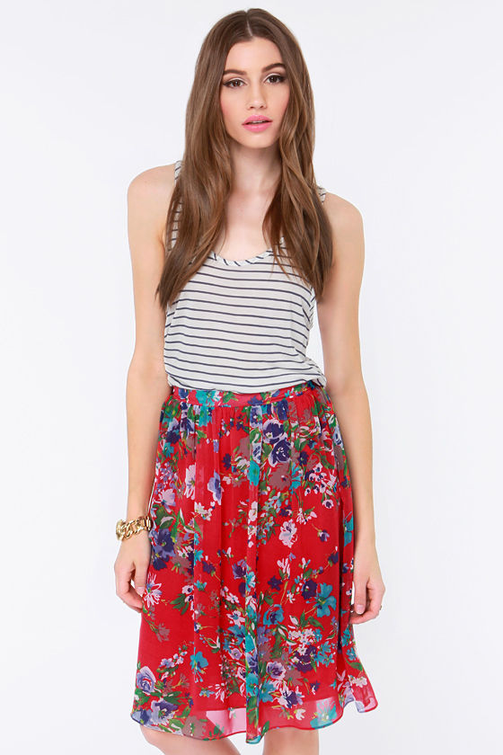 AS SEEN IN REDBOOK!! They say you don't know love until you experience it and now we know what true love is thanks to the Fleur the One Red Floral Print Midi Skirt! Pretty red Georgette is blooming with bouquets of blue and white flowers that are sure to perk up your day from gathering at a banded, high-cut waist down to a midi length hem. Elasticized band at back of waist offers a flattering fit. Unlined. Model is 5'9" and is wearing a size small. Self: 65% Silk, 35% Polyester. Polyester lining. Hand Wash Cold.