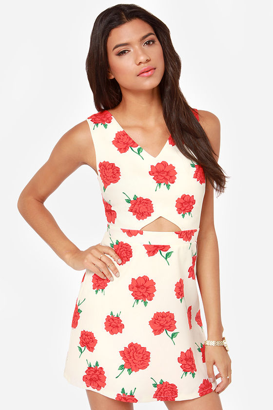Fine tune your wardrobe by adding the always melodious Floral Chorus Red and Cream Floral Print Dress! Woven cream fabric comes alive with red and green floral print covering a sleeveless bodice with side darts and a classy A-line skirt. A sexy V-neckline in front and back complements a front cutout that sits just above a banded waist. Hidden back zipper. Lined. Model is 5'10" and is wearing a size small. 100% Polyester. Dry Clean Only.