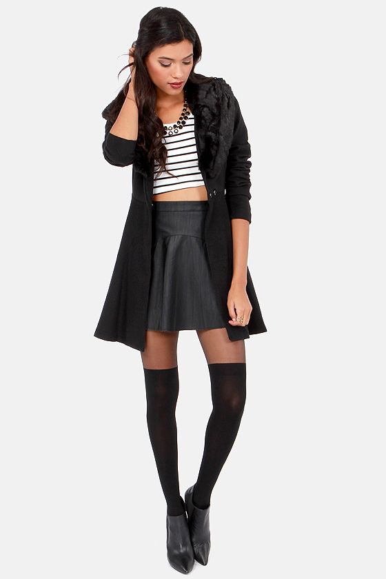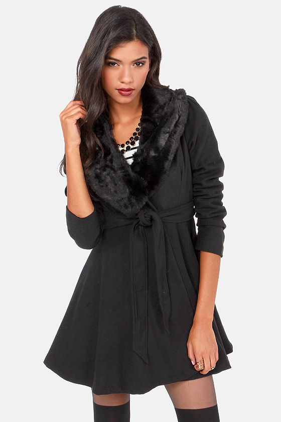You'll forget about all your other outerwear as soon as you try the Fur Give and Fur Get Black Frock Coat! A removable faux fur trim lines the neck for unforgettable comfort, while a belted sash emphasizes your shape. Two hidden snap buttons close at the waist, while woven fabric flares below for a fashionable frock coat style, plus long sleeves to keep you warm. Fully lined in satin. Model is 5'10" and is wearing a size small. Self: 60% Cotton, 40% Polyester. Lining and Trim: 100% Polyester. Dry Clean Only.