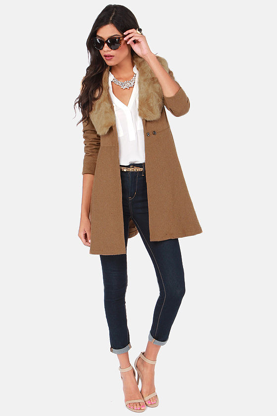 You'll forget about all your other outerwear as soon as you try the Fur Give and Fur Get Tan Frock Coat! A removable faux fur trim lines the neck for unforgettable comfort, while a belted sash emphasizes your shape. Two hidden snap buttons close at the waist, while woven fabric flares below for a fashionable frock coat style, plus long sleeves to keep you warm. Fully lined in satin. Model is 5'10" and is wearing a size small. Self: 60% Cotton, 40% Polyester. Lining and Trim: 100% Polyester. Dry Clean Only.