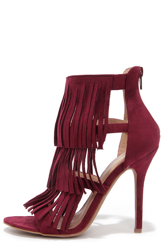 The Gypsy Queen Oxblood Suede Fringe Dress Sandals make it "reign" with three layers of cascading fringe! These beautiful vegan suede heels have a peep-toe, caged upper with plenty of fringe, and an over-the-ankle height. 3.5" heel zipper.