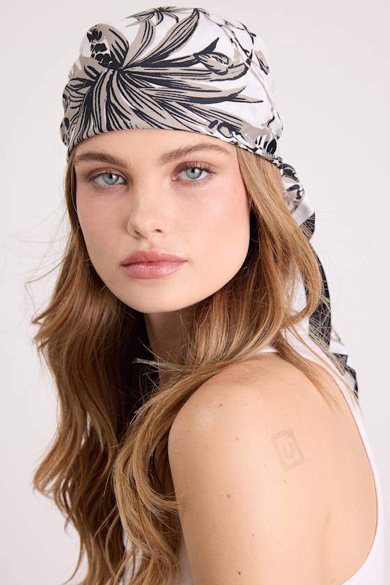 From creating darling hairdos to personalizing your favorite handbag, this satin scarf is bound to be your favorite accessory this season. A minimalistic, abstract floral print adorns the classic square-shaped silhouette, along with black trim along the borders. Add to any look in any way for a boho-chic finish!