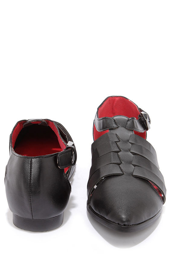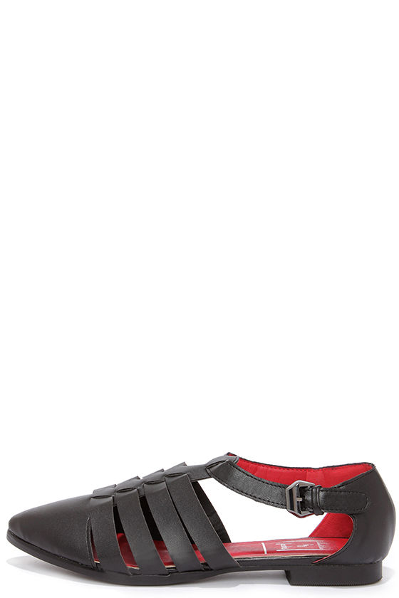 Skip down the block to show off your new and oh-so-cute Hopscotch Black Caged Pointed Flats! Sleek black vegan leather gives this classic flat an upgraded look with a pointed toe upper and caged straps, plus a cutout vamp, and adjustable ankle strap with gunmetal buckle. 0.25" rubber heel. Cushioned insole. Rubber sole has nonskid markings. Available in whole and half sizes. Measurements are for a size 6. All vegan friendly, man made materials.