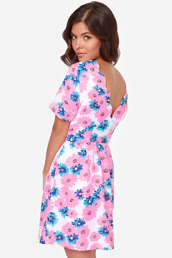 As Seen On Veronica of Bittersweet Colours! The I. Madeline You Grow, Girl Neon Pink Floral Print Dress has flower power aplenty to keep you looking and feeling your best! Neon pink and blue flowers bloom brightly across thick woven ivory fabric, while a scalloped surplice back (with modesty snap) is delightfully fun and feminine. A bateau neckline rests between short sleeves, with a full skirt offering a few pleats tucked into the waist. Hidden side zipper. Body of dress is lined in smooth fuchsia woven fabric. Model is 5'7" and is wearing a size small. 100% Polyester. Dry Clean Only.