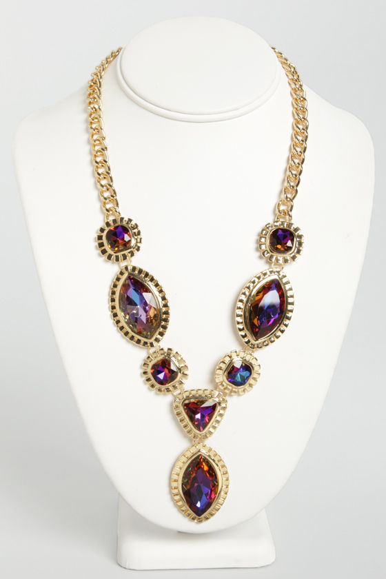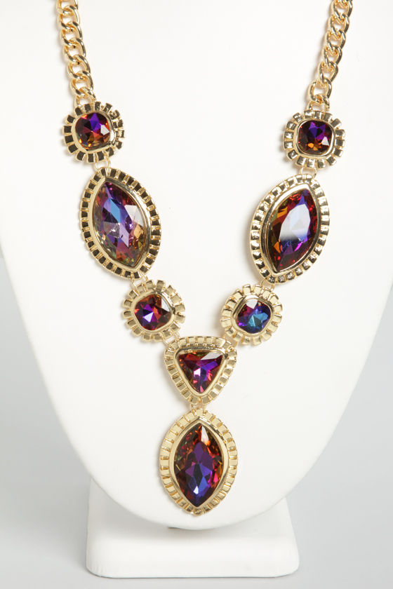 You don't have to be a princess to wear gorgeous sparkling gems; all you need is the Jasmine's Gems Gold Rhinestone Necklace! A shiny gold chain supports a tiered V of iridescent faceted gems that are inset in textured gold charms and brilliantly flash gorgeous shades of colors from red, purple, and blue to everything in between. Necklace measures 19" around, plus a 3" extender chain. Charm drops 2.75" from the center. Man Made Materials.