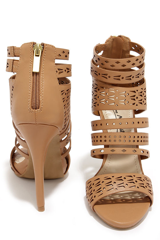 There's something so stunning about intricate cutouts, and the cute caged design of the Lacy-like Behavior Natural Perforated Caged Heels! Beige vegan leather straps shape a peep toe upper with an over-the-ankle height, and a 3" heel zipper with gold pull. 4.5" wrapped stiletto heel. Cushioned insole. Nonskid rubber sole. Available in whole and half sizes. Measurements are for a size 6. All vegan friendly, man made materials.