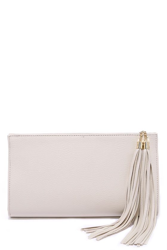 Pretty things gravitate to you, and the Love of Finery Light Beige Clutch is no exception! Perfect for a night out, this rectangular vegan leather clutch has a detachable tassel charm, magnet closures, and interior zipper pocket. 50" gold chain strap.