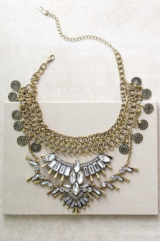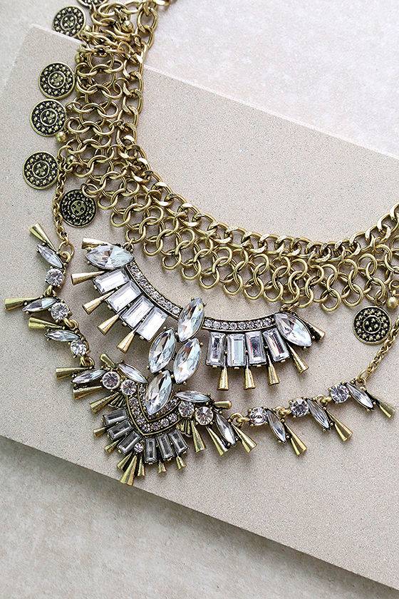 Lulus Exclusive! We see plenty of compliments in your future with the Love Tarot Gold Rhinestone Choker Necklace! This dazzling antiqued gold choker features engraved charms, and rows of clear rhinestones. Necklace measures 11" around with a 4" extender chain.