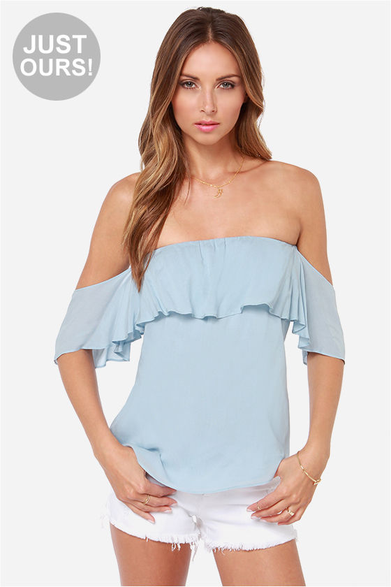 LULUS Exclusive Flutter You Doing? Off-the-Shoulder Blue Top