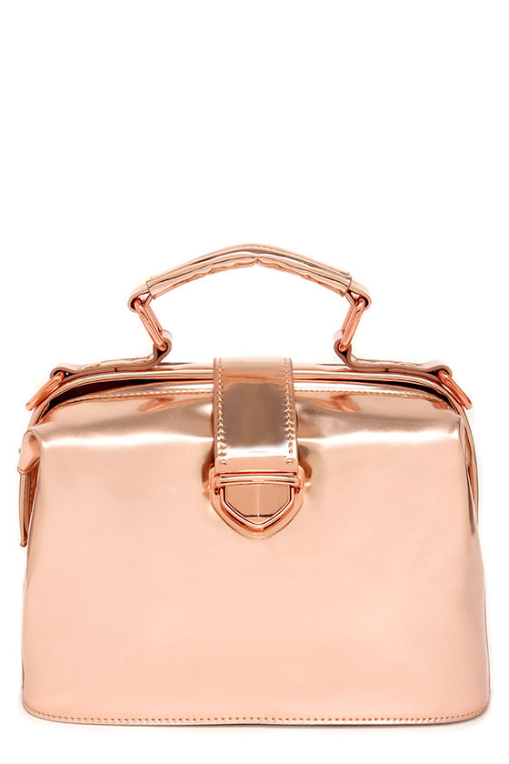 Even if the doctor is out, your accessories will always be in with envy-inducing bags like the Mystique of Nature Rose Gold Bag! Rose gold vegan leather has a metallic, mirrored finish shaping a structured, mini doctor bag-satchel hybrid with matching rose gold hardware. Unlatch the front metal push button closure and open the hinged top to reveal a black and white striped interior including three pockets with plenty of space to store your phone and cosmetics. Carry by the top handle or attach the adjustable 49" shoulder strap (at longest adjustment). Purse measures 10" wide, 7.5" tall and 4.5" deep. 100% Polyurethane exterior. All vegan friendly, man made materials.