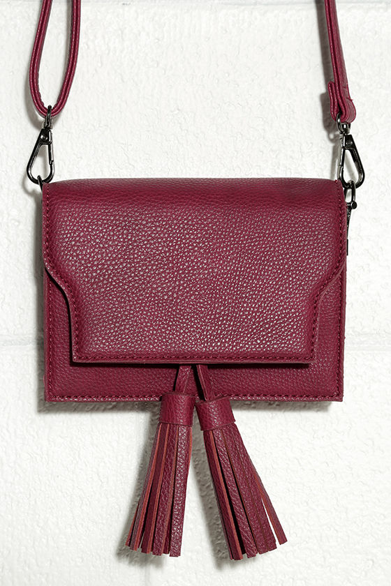 You'll be on your way to fashion greatness thanks to the On the Fringe Burgundy Purse! This pebbled vegan leather purse has a cute, structured look with a angular front flap, shiny gunmetal hardware and two decorative tassels. Open from the magnet closure to two interior compartments to store your lipstick or phone! Detachable shoulder strap measures 50" at longest adjustment. Purse measures 7" wide, 5" tall, and 2" deep. Tassel measures 4" long. All vegan friendly, man made materials.