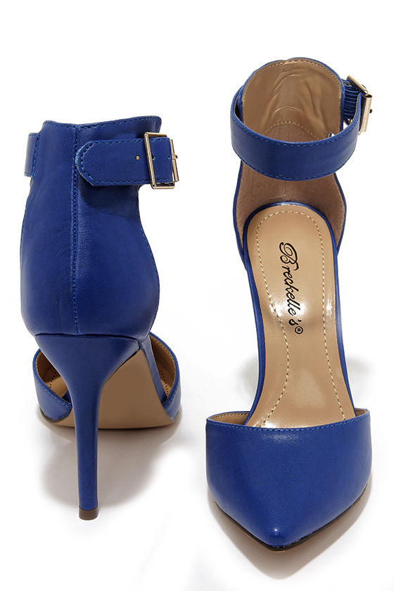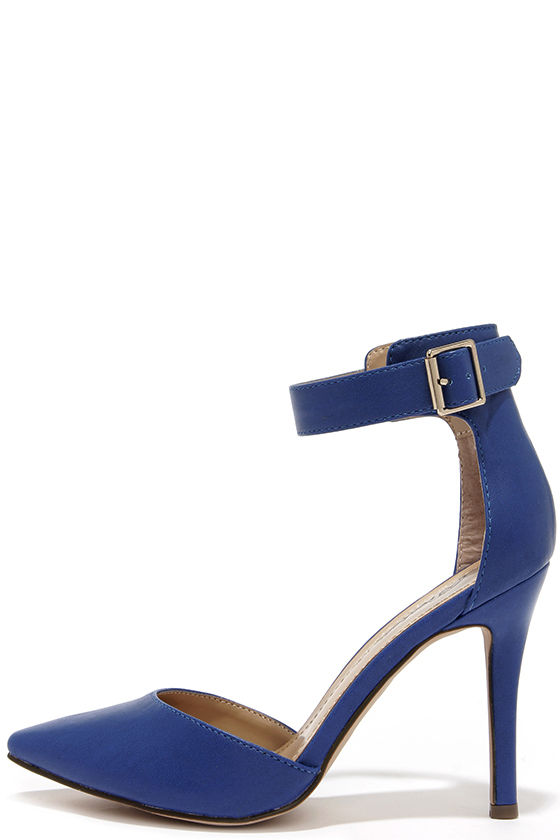 You can count on Lulus to lead you to fashion bliss, and right now, we're lovin' the Point the Way Blue Ankle Strap Heels! These versatile vegan leather heels have a pointed toe split upper with an adjustable ankle strap and gold buckle. 4" wrapped stiletto heel adds the perfect amount of height. Cushioned insole. Rubber sole has nonskid markings. Available in whole and half sizes. Measurements are for a size 6. All vegan friendly, man made materials.
