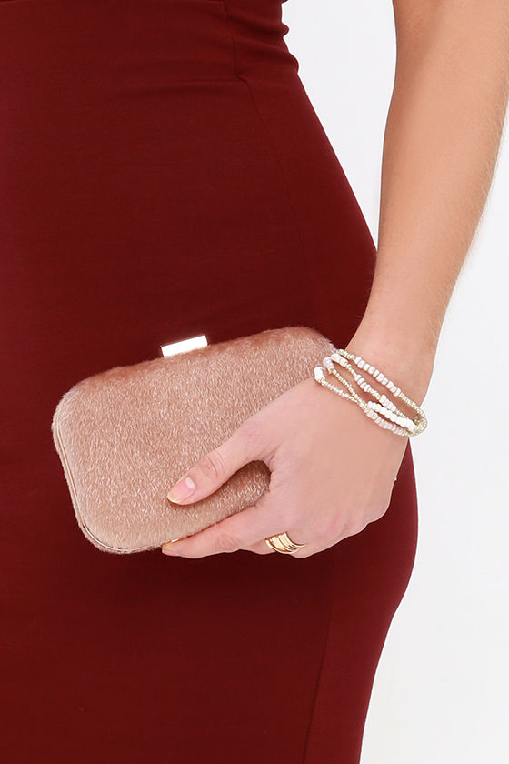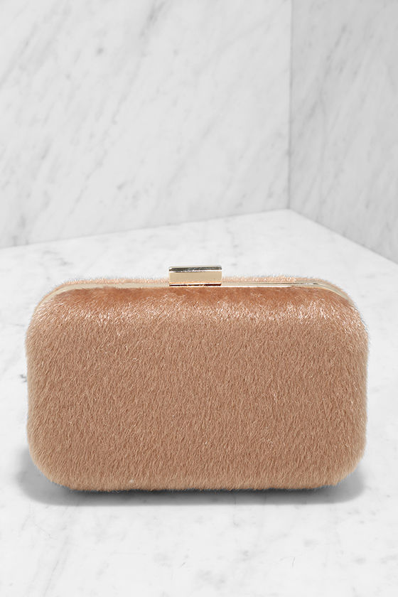 Out of all of the style tricks we have up our sleeve, the Pony Show Beige Faux Fur Clutch is one our favorites! Make a statement with this beige faux pony fur clutch (with rose-y undertones) and gold trim. Open the sturdy case from the top clasp to a black fabric interior with elastic sides and side wall pocket. Carry as a clutch or attach the 50" gold chain strap.