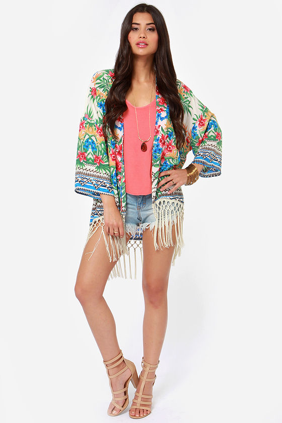 Any climate feels extra inviting with the tropical style of the Roll the Paradise Floral Print Kimono Top! Tropical floral print pops with bright shades of green, pink, blue, and orange on a creamy backdrop down short sleeves and an open front. 8" of cream fringe hangs from a high-low hem for a beautifully Boho look. Unlined. Model is 5'7" and is wearing a size small. Top measures 3" longer at back. 100% Polyester. Hand Wash Cold.