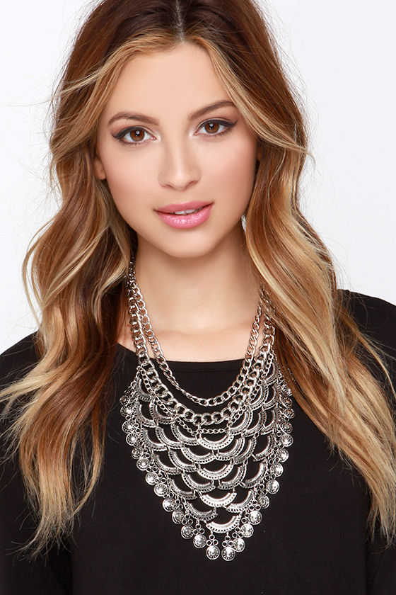 Break away from the ordinary to discover your best piece yet: the Sea the World Silver Statement Necklace! Two strands of antiqued silver chain support this stunning bib necklace with pierced and engraved half circle charms that join to form a scalloped design. Circular embossed charms trim the outer edge for added Bohemian flair. Necklace measures 17" around, plus 3" extender chain. Lobster clasp closure. Man made materials.