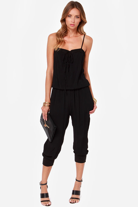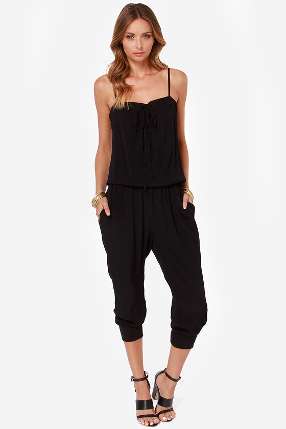 When it comes time to endorse your pick for best jumpsuit of the season, we know it'll be the Seal of Approval Black Jumpsuit! Ribbed stretchy knit cuffs on cropped pant legs match a strip of ribbed knit around the neckline (with a fun drawstring) that is supported by adjustable spaghetti straps. Flowing woven fabric takes over from there, creating a loose and lovely bodice and pant legs with an elasticized waist in between. Side seam pockets. Bodice is lined in stretchy knit. Model is 5'9" and is wearing a size small. Self: 52% Rayon, 48% Viscose. Contrast: 98% Polyester, 2% Spandex. Lining: 95% Rayon, 5% Spandex. Hand Wash Cold.