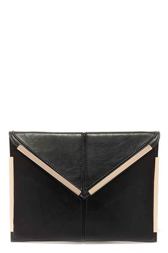 Show a little love to your handbag collection with the Secret Admirer Black Clutch! This vegan leather clutch has a chic envelope shape, with tonal top-stitching and shiny gold trim accentuating its structured design. A front magnet closure conceals a spacious fabric-lined interior with an additional side wall pocket. Carry as a clutch or attach the 47" long gold chain. Clutch measures 12" wide, 8.5" tall and 0.5" deep (relaxed). 100% Polyurethane exterior. All vegan friendly, man made materials.