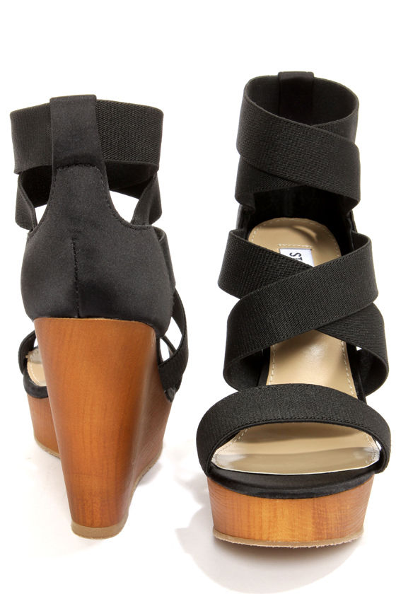 With so many gorgeous details, the "Val" is about to be your fav new gal pal! The Steve Madden Val Black Strappy Platform Wedges have a black toe strap that sits above a sweet peep toe, while stretchy black straps crisscross at the vamp and ankle before wrapping around to a heel cup with a subtle sheen. 1" toe platform rises into a leg-lengthening 4.5" wooden wedge heel (with rubber tip). Cushioned insole. Non-skid rubber sole. Available in whole and half sizes. Measurements are for a size 6. Man made materials.