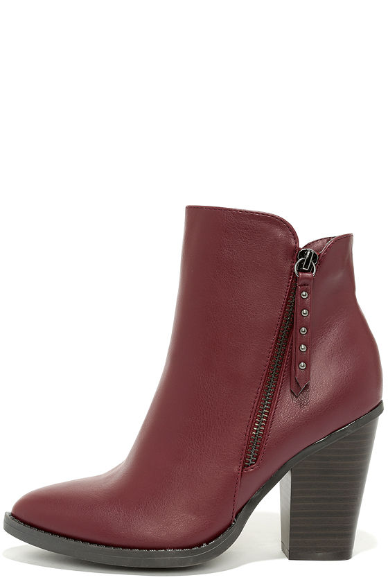 Inspiring outfits for seasons to come, the Style Icon Burgundy Ankle Boots are your most affordable style splurge! Smooth oxblood red vegan leather shapes a pointed toe and 5.5" shaft with a trendy notched collar. A decorative gunmetal zipper at the outstep includes a studded zipper pull, while a 5.5" tonal zipper at the instep offers easy on-off access. 3.75" dark brown block heel. Cushioned insole. Nonskid rubber sole. Available in whole and half sizes. Measurements are for a size 6. All vegan friendly, man made materials.