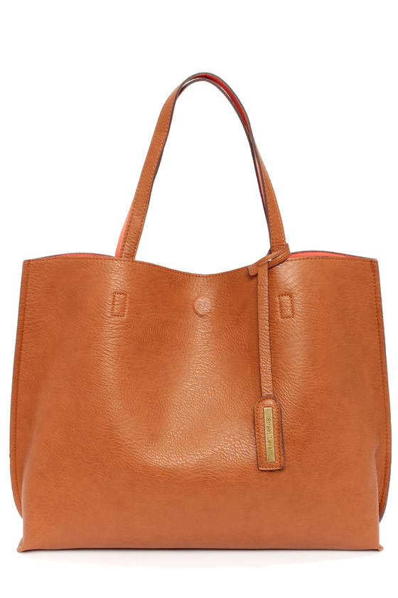 As Seen On Jennifer of JennifHSIEH! Finally, a tote that changes to match your mood (and your outfit): the Switch it Up Reversible Tan Tote! Soft tan vegan leather creates a sleek exterior that fastens with a hidden magnetic closure at top. A coral vegan leather mini bag with zip closure is included inside, but the real bonus is the option to flip this chic tote inside out, putting the coral interior on display. Carry from twin tote handles with an 8" drop. Tote measures 17" wide, 13" tall, and 5" deep. Bonus mini bag measures 8" wide, 6.25" tall, and 0.5" deep (relaxed). All vegan friendly, man made materials.