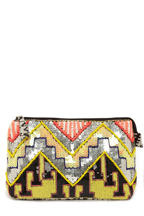 Get lost in the dazzling array of vibrant beading and sequins in the Technicolor Dreams Multi Sequin Clutch! Soft black and white tribal print canvas shapes this zip-top pouch, with an intricate sequin design in metallic silver, black, and yellow, plus coral, and yellow beaded chevron accents. Open the top zipper closure to reveal a roomy interior with fabric lining and one additional pocket. Clutch measures 12" wide, 7" tall and 3" deep (relaxed). 100% Cotton.