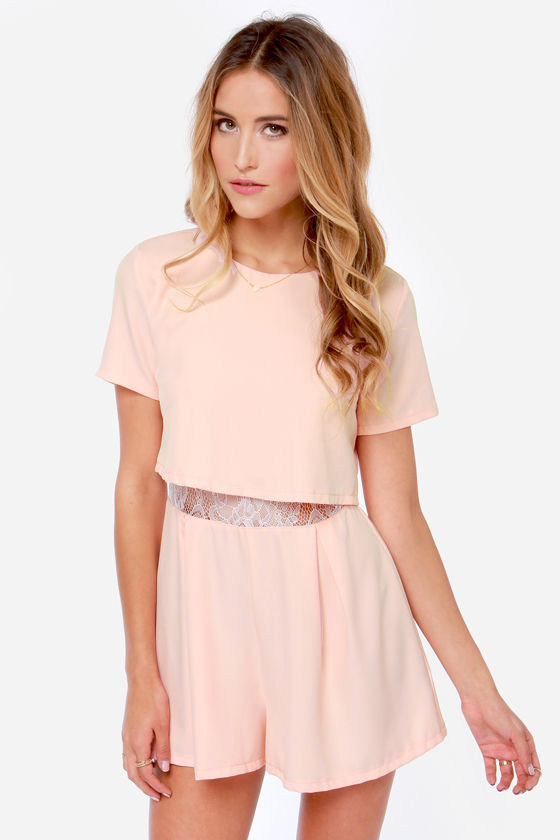 With so many adorable details, we never get tired of hearing about the Tier We Go Again Peach Romper! Soft, peach twill has a subtle stretch to it across a short sleeve bodice with a wide-cut and cropped hem. Sheer white lace makes a peekaboo presence along the midriff and butterfly back, finished by flowy pleated shorts in more peach. Hidden back zipper/hook clasp. Front of bodice is lined. Model is 5'8" and is wearing a size small. Shell 1 and Lining: 100% Polyester. Shell 2: 100% Nylon. Hand Wash Cold.