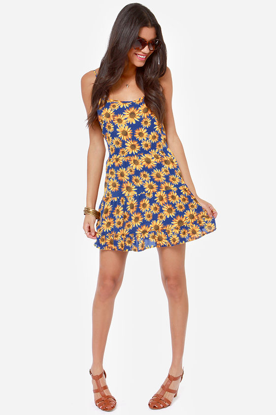 From mountains high and rivers low, there isn't a dress on this planet that's cuter than the Under the Sunflower Blue Floral Print Babydoll Dress! Beautiful yellow sunflowers brighten up any day as they bloom across a woven blue babydoll dress with a breezy, relaxed fit and ruffle hem. Spaghetti straps frame a rounded neckline and cruise to a strappy open back that has a bit of elastic at the waist. Unlined. Model is 5'10" and is wearing a size small. 100% Polyester. Hand Wash Cold.