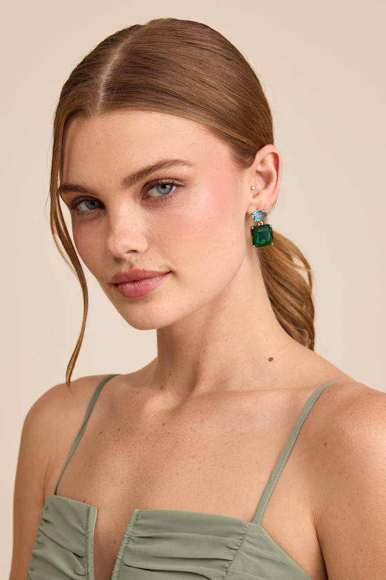 Manifesting glamorous energy is almost too easy thanks to these stunning earrings that know how to stand out all on their own. Vibrant rhinestones in hues of turquoise and green make up the dangly drop design, featuring oval-shaped posts that support even shinier square-shaped baubles.