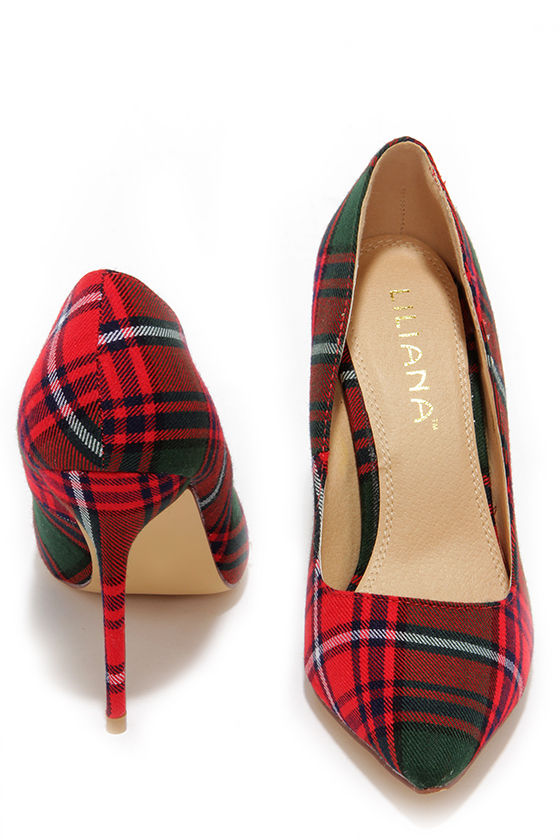 From Highlands to high rises, the Who's Plaid! Red Plaid Pumps are sweeping the globe with their good looks! These cuties feature a red, green, white, and navy plaid fabric upper with a pointed toe. Wrapped stiletto heel measures 4" tall. Cushioned insole. Felted rubber sole has nonskid markings. Available in whole and half sizes. Measurements are for a size 6. All vegan friendly, man made materials.