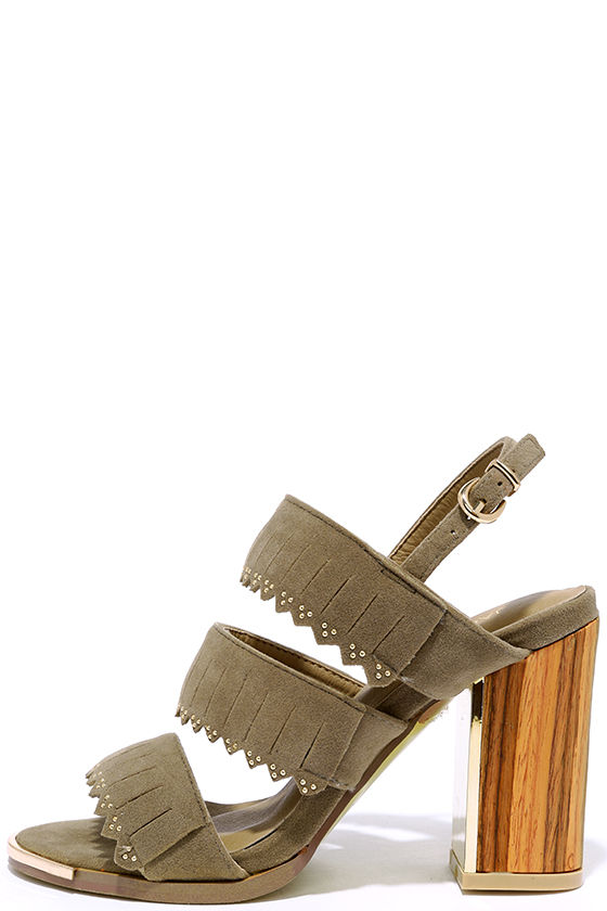 Boho glam has reached new heights thanks to the arrival of the Wood-n't Ya Know Taupe Suede High Heel Sandals! These vegan suede stunners have a peep-toe upper, strappy vamp with stitched fringe and gold studs, and an adjustable buckle ankle strap. Shiny gold accents the toe and block heel.